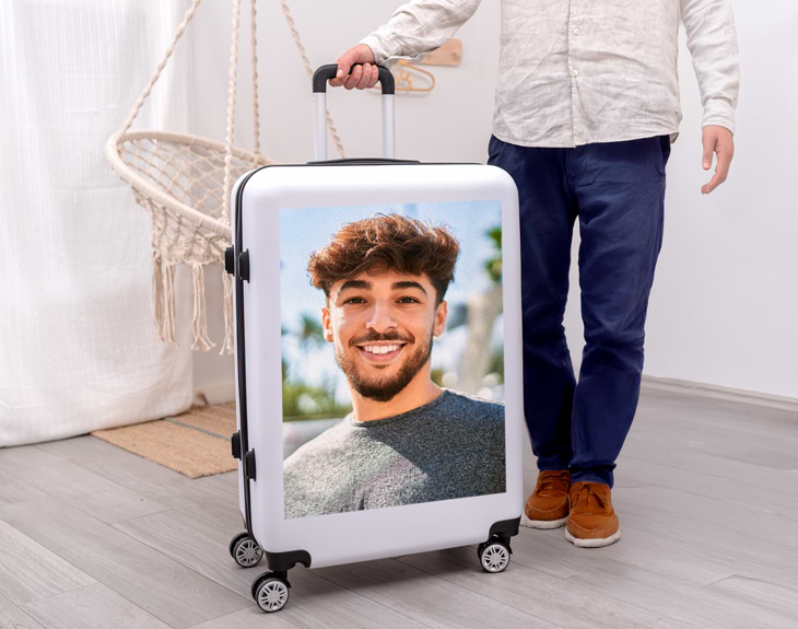¿Planeando tu próximo viaje? Vayas donde vayas, es hora de que te lleves tu propia maleta grande personalizada con esa foto o imagen que quieres que vea todo el mundo. Esta maleta es la más grande de nuestra colección y es perfecta para viajes duraderos o a esos donde tienes que llevar mil cosas por si acaso. Además de ser un accesorio único para viajar, también puede ser un regal súper guay para esas personas que aman viajar. Porque esta original maleta no pasará desapercibida en ningún aeropuerto ni estación de tren. ¡Podrás añadir la imagen que tú quieras! Para personalizar esta maleta solo tienes que acceder a nuestro diseñador. Una vez dentro, podrás añadir esa foto o imagen que tanto te gusta y colocarla dentro del área blanca para que se ajuste perfectamente. Nosotros nos encargamos de que quede perfecto y lista para recorrer mundo. Medidas: - Maleta grande: 74 cm x 47 cm x 29 cm. El interior está compuesto por dos compartimentos con cremallera, donde podrás organizar toda la ropa y los complementos para no perder nada. Además, también cuentan con un bolsillo en el que guardar cualquier tipo objeto. Importante: la maleta cuenta con un sistema de seguridad con candado TSA. Las cremalleras de la maleta se pueden introducir en dos espacios, protegidos por este código. Si no introduces el código correcto, las cremalleras no podrán salir y no se podrá abrir la maleta.