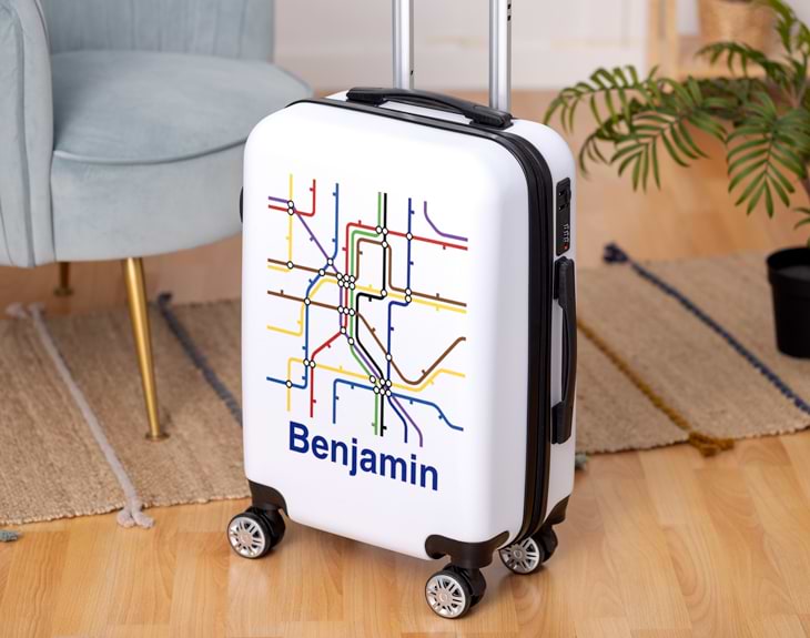 Sabemos que hacer la maleta puede ser una tarea de lo más agotadora, pero eso significa que te vas de vacaciones o que estás a punto de irte de viaje a tu sitio favorito. Por eso, si hay algo que no puede fallar en esta nueva aventura es llevar tu nueva maleta personalizada. Y es que si eres un apasionado/a de los transportes como los trenes, su diseño con el plano del Metro de Madrid te encantará. nuestra misión es que tengas la maleta más original del mundo. O que por lo menos se la regales a alguien para dejarle sin palabras por lo guay que es su diseño. Esta maleta de cabina disponible en tres colores (blanco, rojo y negro), tiene el tamaño perfecto para acompañarte en cualquier aventura y darte un poco de diversión si quieres jugar a adivinar las paradas mientras esperas tu tren o avión. ¡Es lo más! Pero antes de poder viajar por el mundo con tu maleta, recuerda que puedes personalizarla con tu nombre. Solo tienes que entrar en nuestro diseñador, rellenar el espacio vacío y listo. Así de fácil. ¡Será el regalo más divertido y friki del mundo! La maleta tiene dimensiones de mano, con lo que podrás llevarla contigo en el avión en la mayor parte de las aerolíneas (easyJet, Iberia, Vueling y muchas otras).