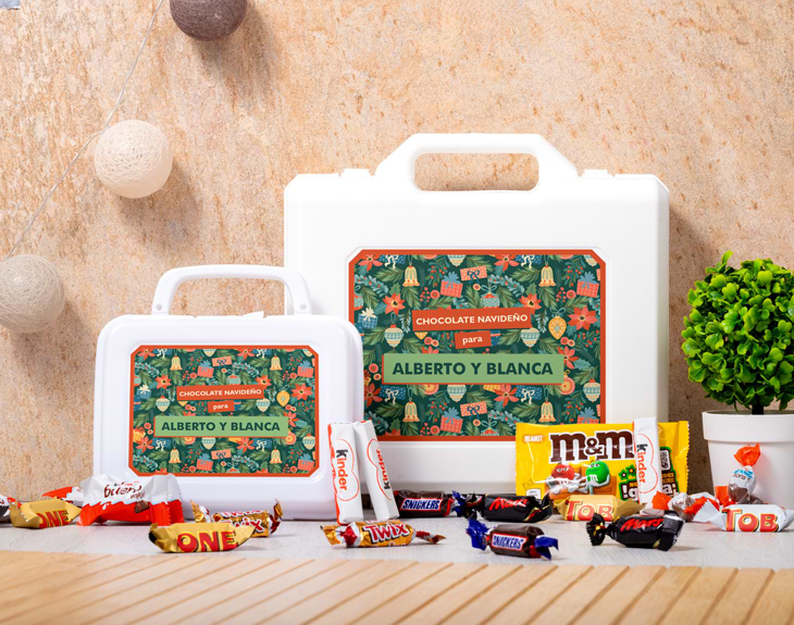 En Navidad no puedes tener la bandeja de chocolates vacía. ¡Siempre hay un amigo o familiar al que invitar al mejor dulce! Este año, podrás sorprenderles a todos ellos con una degustación especial: sobre tu maletín de chocolates personalizado. Cuando les visites en Nochebuena o Nochevieja, podrás llevar contigo cómodamente todos los caramelos y barritas cómodamente con el asa de este maletín tan útil. Si no quieres arriesgarte con polvorones demasiado extravagantes, apuesta por un valor seguro: habrá algo para cada invitado entre esta variedad de los mejores sabores de chocolatinas. Desde Kinder o Toblerone hasta M&M's, cada uno vendrá en su envoltorio individual. Con ellos, ¡a tus hijos no les hará falta ni la cabalgata este año! Coloca este maletín debajo del árbol y escribe la felicitación navideña que quieras en la tarjeta recordatoria que se incluye gratuitamente. Así tendrás el más dulce regalo de Navidad original. Medidas: - Maletín pequeño: 20 cm x 16 cm x 7 cm. - Maletín grande: 29 cm x 29 cm x 9 cm. Importante: en los meses cálidos del año, los productos Kinder Bueno Mini y mini barritas serán sustituidos por otros productos Kinder. Importante: Las chocolatinas pueden variar según stock, pero no te preocupes estarán igual de deliciosas.