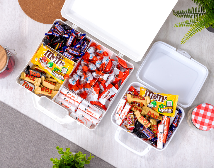 Contenido con cantidades aproximadas: Maletín de chocolate pequeño: • 6 Kinder Chocolate • 10 Kinder Schoko-Bons • 9 Caramelos de chocolate (Mars, Twix, Snickers) • 10 Mini Kinder Bueno • 9 Mini Toblerone (chocolate con leche, negro y blanco) • Maletín de plástico de 20cmx16cmx7cm (aprox.) • Tarjeta recordatoria Maletín de chocolate grande: • 12 Kinder Chocolate • 20 Kinder Schoko-Bons • 20 Caramelos de chocolate (Mars, Twix, Snickers) • 12 Mini Kinder Bueno • 16 Mini Toblerone (chocolate con leche, negro y blanco) • 2 Bolsas de M&Ms 45g • Maletín de plástico de 29cmx29cmx9cm (aprox.) • Tarjeta recordatoria