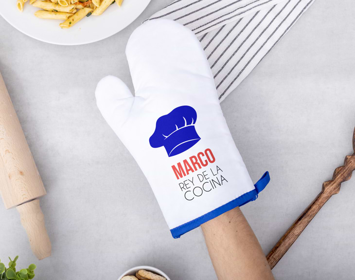 ¡El rey de la cocina se merece lo mejor! Si conoces a alguien que vive para cocinar y siempre está preparando sus platos estrella, nuestra manopla de cocina personalizada "Rey de la Cocina" es el regalo ideal. Con un diseño único que incluye un gorro de chef, este accesorio le permitirá seguir creando sus deliciosas recetas sin preocuparse por quemaduras. ¡Con esta manopla, no solo estará protegido, sino que también se sentirá como un verdadero chef profesional! Este regalo es perfecto para cualquier ocasión: cumpleaños, amigo invisible o simplemente para sorprender a esa persona especial que se dedica a conquistar paladares. Y lo mejor de todo es que es personalizable: podrás poner el nombre del destinatario y hacerlo aún más especial y único. Para personalizar la manopla, solo añade el producto al carrito y dirígete a la sección de personalización. Escribe el nombre de tu chef favorito, y nosotros nos encargamos de crear un regalo original. ¡Haz que se sienta como el verdadero rey de la cocina!
