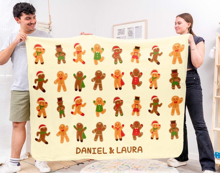 Ya llega la época más esperada del año, ¡la Navidad ya está aquí! Siempre son unas fechas muy especiales en las que nos reunimos con familiares, comemos muchos dulces y si nos hemos portado bien, recibimos un montón de regalos. Algo que no puede faltar en Navidad son las galletas de jengibre, por eso, nuestra manta amarilla personalizada con diseño "Muñecos de jengibre" es perfecta para esta ocasión. Lo mejor de esta manta es que es personalizable, podrás escribir el nombre que tú quieras. Esta mantita de color amarillo es genial para esos días de mucho frío en los que solo apetece quedarse en casa bien calentitos viendo una peli. Si quieres sorprender a esa persona que adora los planes caseros, está claro que esta manta será el detalle perfecto. Personalizar esta manta amarilla es muy sencillo. El primer paso a seguir consiste en añadir el producto al carrito y entrar al área de personalización. Una vez ahí, ya puedes escribir el nombre que tú quieras. Pronto estará perfecta y lista para regalar. ¡Será un original regalo para el invierno! Medidas: 130 cm de alto x 180 cm de ancho. Las medidas pueden varias unos centímetros, son aproximadas. Material: 100% poliéster.
