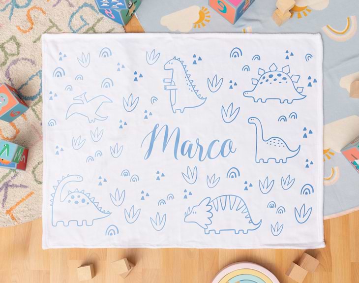 Cuando nace un bebé, lo que más queremos es pasar tiempo con él y también llenarle de pequeños regalitos. Por eso, esta mantita personalizada es perfecta para sorprender a sus papis, así podrán utilizarla durante los primeros meses de vida del peque y asegurarse de que no pasa nada de frío y está súper calentito siempre que la tenga encima. Es el regalo perfecto para la llegada del nuevo miembro de la familia. Esta original mantita de color blanco es el detalle ideal para el más peque de la casa. No hay nada como un abuena manta para arroparle cuando es un bebé, porque además al ser de coralina es suave y muy gustosa, por lo que al peque le encantará acurrucarse en ella. ¡No habrá mejor regalo que este! Personalizar esta manta para bebés es súper sencillo. El primer paso consiste en añadir el producto al carrito y entrar al área de personalización. Una vez ahí, podrás personalizar este diseño de dinosaurios con el nombre del niño o niña y listo. ¡Así todos sabrán cómo se llama el nuevo miembro de la familia! Quedará perfecta y lista para regalar. ¡Triunfarás en cualquier ocasión! Medidas: 100 x 75 cm.