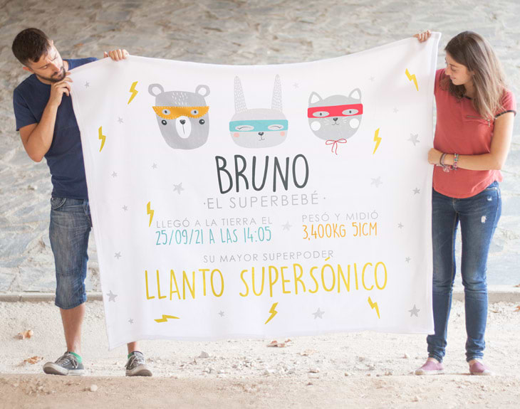 ¡Ha llegado una nueva gran criatura a casa! Tu bebé va a trastocar toda tu rutina y más de una vez te va a tocar dormir al lado de la cuna o en el sofá. ¿Qué mejor manera de hacerlo que recordando por quién lo haces? En esta manta personalizada puedes inscribir todos los datos específicos de tu bebé. ¡Desde su nombre hasta su peso y altura de nacimiento! Esta manta es el regalo más original y divertido no solo para ti, sino para tus padres o tus suegros. Cada vez que tengan frío, se arroparán acordándose de su recién llegado nieto/a. Y cuando pase el tiempo y deje de ser bebé, ¡seguro que le gusta recordarlo todo sobre su llegada a este mundo! Graba en esta manta toda esa información personal que no quieres olvidar. Y además, elige cuál es el superpoder de tu superbebé. ¿Llanto supersónico? ¿Exterminador de pañales? ¡Deja volar tu creatividad y alégrate cada vez que tengas que pasar una noche más larga! Las medidas pueden variar unos centímetros, son aproximadas.