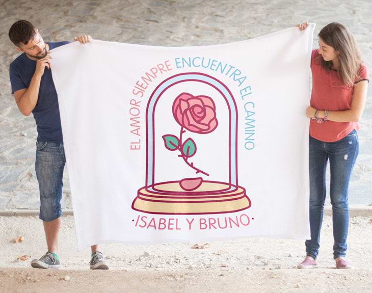 Sin embargo, lo que convierte esta manta en un regalo tan especial, es sin duda su personalización y su romántico diseño en tonos pastel y su mensaje. Inspirado en la película de la Bella y la Bestia (una de las más románticas películas de Disney) encontramos como pieza central la rosa que marca la historia de Disney. Rodeando la cúpula de la rosa, encontraremos la frase que emocionará al destinatario al 100%: El amor siempre encuentra el camino, porque, ¿acaso vuestro amor no es capaz de superar todas las barreras del mundo? Para completar el diseño, en la parte inferior de la manta irán impresos vuestros nombres, haciendo el regalo aún más especial y único.