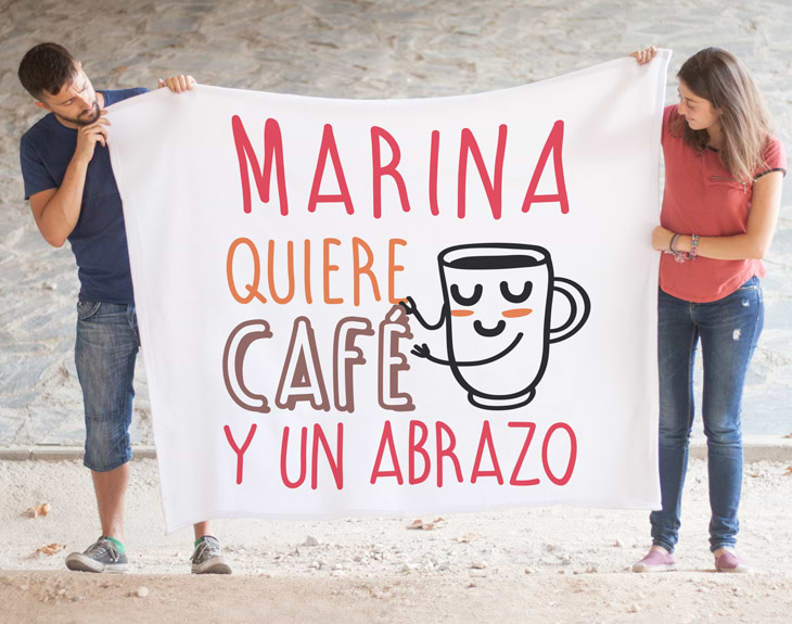 • Manta polar para sofá 170cmx130cm • Tarjeta recordatoria. Son muchos los que, hasta que no se toman su café mañanero, no son personas. No hay nada mejor que despertarse con un café cargadito y un dulce abrazo de la persona que más queremos. Por ese motivo, nuestra manta personalizada está diseñada con ese lema. Para nosotros, no hay nada mejor para levantar el ánimo que un buen abrazo y un delicioso café pero, si no podemos estar con esa persona físicamente ¿qué mejor manera de decírselo que con una suave y calentita manta personalizada? El diseño de esta manta es la parte más importante del producto. Con un texto en tonos naranjas, rojos y marrones, incluimos la frase “Quiere un café y un abrazo”. Sobre ella, irá colocado el nombre que nos indiquéis al hacer vuestro pedido. La zona de la derecha está reservada a un monísimo dibujo de una taza de café con los brazos extendidos para abrazar a quién esté a tiro. Una forma adorable de decir a esa persona que estamos siempre a su lado para lo que necesite. En cuanto a sus características físicas, esta manta está fabricada en tela polar blanca, de manera que el diseño destaca a todo color. Su grosor es de unos 3 milímetros, lo que la hace perfecta para ser guardada en cualquier rincón sin ocupar mucho espacio pero sin renunciar al aislamiento que nos ofrece la propia tela polar, un tejido especialmente preparado para no dejar entrar el frío y para retener el calor al máximo. En cuanto a su tamaño es perfecta para cubrir sin problemas a una persona adulta, gracias a su largo de 170 cm y su ancho de 130 cm. Además, esta manta podrá lavarse sin problemas cuando lo necesites ya que se prepara especialmente para que el diseño no se pierda con el tiempo. Todos necesitamos un abrazo de ánimo y un café con amigos de vez en cuando pero, cuando la persona que nos los puede dar se encuentra lejos, se hace mucho más difícil. Por eso, regalos como este, que nos permiten mandar “abrazos virtuales”, son perfectos para ayudar a quién más queremos a tener ese empujoncito extra o a alegrarle un mal día. ¡Estamos seguros de que no podrá evitar sonreír cuándo la vea!