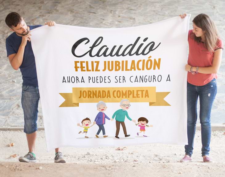 La jubilación es una época soñada por la mayoría de los que trabajamos. El fin de una vida de responsabilidad, madrugones, trabajo duro y problemas es de lo más tentadora pero, sin duda, lo mejor de la jubilación es disfrutar, al fin, del tiempo libre que nos hemos ganado. Ya sea para viajar, para disfrutar de tus hobbies o para pasar más tiempo con la familia y amigos, la jubilación es una época perfecta y que hay que celebrar por todo lo alto. Si a tus padres se les cae la baba con sus nietos, estamos seguros de que esta preciosa manta personalizada Canguro a jornada completa les encantará como regalo de jubilación.