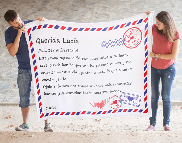 ¿Quieres enviarle una carta de amor a tu pareja o hacerle una bonita dedicatoria pero no quieres hacerlo de la manera tradicional? Olvídate de la típica carta o un texto por redes sociales: dile todo lo que sientes de la manera más original con esta manta personalizada. ¡La recibirá a los pocos días en su casa, como si fuera un correo normal! Sorpréndela con tus palabras escritas en esta manta de más de metro y medio de largo. Además de ser el regalo más original y amoroso, será el complemento más especial de vuestras tardes de peli o de juegos de mesa. ¡Podéis arroparos los dos juntos junto a estas palabras de amor! También puedes escribir un emotivo mensaje sobre la manta para algún amigo/a especial o algún familiar. ¡Tú eliges el texto y nosotros lo ponemos al estilo carta de la manera más bonita! Regálale a esa persona tan especial estos 300 caracteres de lo que sientes que le alegrarán las tardes más frías. Este producto ofrece tres opciones distintas de mantas, dependiendo del gusto de la persona a la que se le vaya a regalar. Si lo que más le apasiona es una manta aterciopelada, de esas que dan mucho gusto cuando te la pones encima, la manta polar es la mejor opción. Por otro lado, si prefieres una que sea muy calentita y suave, y te abrigue en las largas noches invernales, la manta coralina es perfecta para esa persona especial. Y por último nuestra manta sherpa que tiene un poco de ambas: el borreguillo más calentito y la suavidad de la manta coralina. Importante: Las medidas pueden varias unos centímetros, son aproximadas.