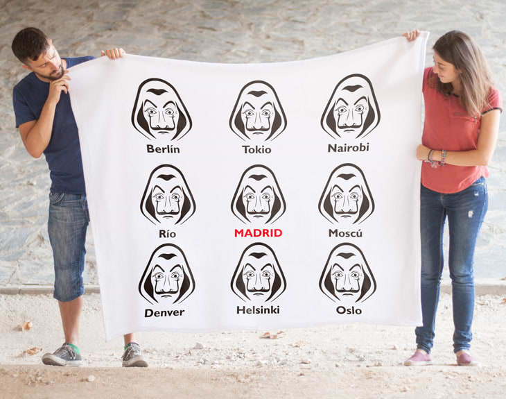 Conviértete en un personaje más de La casa de papel, con máscara de Dalí incluida, junto a los personajes más emblemáticos de la serie: Berlín, Tokio, Nairobi… Si has imaginado con tus amigos qué nombre de ciudad tendrías si formases parte de la banda, esta es tu oportunidad de hacer realidad tu sueño más divertido. Nuestra manta personalizada es el regalo más espectacular para los fans de la serie española.