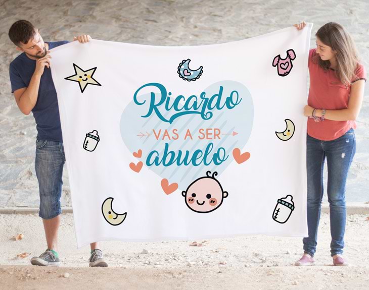 ¿Has pensado ya cómo decirle a tu padre que le vas a dar un nieto? ¿Quieres sorprender a tu suegro con esta gran noticia? Llénales a ambos de ilusión a la vez que les das un regalo útil y original con esta manta personalizada con sus nombres. Puedes escribir el nombre que quieras y nosotros lo insertamos en este fantástico diseño. Imagina la ilusión que le va a hacer recordar cada día el/la nieto/a que está por llegar. En invierno o en verano, cada vez que se arrope, ¡le sacarás una sonrisa con esta manta! Además de ser muy bonita, la manta tiene el tamaño suficiente como para que él se arrope entero o incluso si la gira podrá compartirla. ¡Verás qué bonita queda en la foto cuando por fin tenga a su nieto/a entre sus manos tras meses de esperarle con esa misma manta! Las medidas pueden variar unos centímetros, son aproximadas.