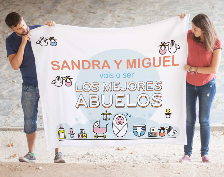 Sorprende a tus padres o a tus suegros con la mejor noticia que pueden escuchar y la manera más divertida de decírselo. Esta manta personalizada es el regalo más original para decirles que van a ser los mejores abuelos. Puedes personalizar esta manta con los nombres de los dos abuelos del futuro bebé para que cada vez que se arropen se acuerden de su nieto/a. Regala esta manta con todos los elementos que esos abuelos y abuelas se tendrán que acostumbrar a ver de nuevo: chupetes, carritos, biberones... Las medidas pueden variar unos centímetros, son aproximadas.