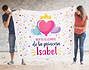 • Manta polar para sofá 170cmx130cm • Tarjeta recordatoria. Los más pequeños son exigentes con los regalos. Si te sales de su lista de regalos deseables, es muy posible que acabes fracasando en el intento y, además, el pequeño no se cortará al decírtelo. Si no quieres cometer ningún error en su cumple de este año, estamos seguros de que la manta personalizada Un cumpleaños real será el detalle perfecto que toda princesa merece en el día de su cumple. ¡Seguro que no se despega de ella! En cuanto a características físicas, os comentamos que nuestras mantas están fabricadas en una suave tela polar de poliéster en color blanco. Es una tela perfecta para este tipo de producto ya que es la más eficaz en lo que a retención del calor se refiere. Además, es una mantita de 3 mm de grosor, que ocupa muy poco espacio y que podremos guardar en cualquier rincón de la casa. Se puede lavar sin problemas en la lavadora y, gracias a su tamaño, hasta una persona adulta podrá cubrirse de pies a cabeza. Lo más especial de esta manta es su precioso diseño y colorido diseño. En el centro de la manta, encontraremos un bouquet de tres globos con forma de corazón, coronados con una corona amarilla. En la parte inferior, aparece el texto “Hoy es el cumple de la princesa” y justo debajo irá colocado el nombre de la destinataria en un rosa fuerte. El diseño se termina de completar con un estampado de lunares de colores y toda la manta presentará un acabado en colores azules, lilas, amarillos y rosas. Como veis, un diseño lleno de color y positividad, que encantará a todo el mundo. Tanto si la destinataria del regalo es una niña o una adulta, estamos seguros de que con esta preciosa y alegre manta conseguirás el objetivo de sorprender a quién más quieres. Un regalo que conservará con todo el cariño del mundo y en el que, en cada uso, sentirá lo importante que es y lo mucho que la queréis. ¡Un regalo perfecto!