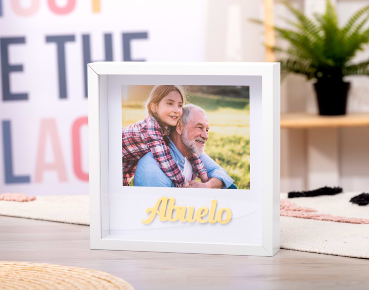 Sin duda, el abuelo es una de nuestras personas favoritas. Siempre llevamos en el corazón los momentos compartidos a su lado, y este gran marco personalizado con foto es una idea maravillosa para regalarle y hacerle sentir único. El marco es de madera y la palabra “Abuelo” está fabricada en metacrilato amarillo pastel, creando un conjunto con mucha ternura, perfecto para sorprender. Los abuelos se merecen todo lo mejor del mundo. Si tú adoras al tuyo sin medida, seguro que valdrá la pena ver su emoción al abrir este regalo original. Es un producto exclusivo con el que quedarás genial y sumarás muchos puntos. También es ideal para regalos para abuelos en fechas importantes o en alguna ocasión especial. Personalizar es super fácil, añade al carrito y solo tienes que elegir un momento significativo, esa foto mas bonita y nosotros nos encargamos de que todo quede perfecto, para que puedas sorprenderle con un detalle inolvidable. Importante: este producto contiene una pequeña ranura en la parte superior. Medidas del marco: 21,5 x 21,5 x 4,5 cm.