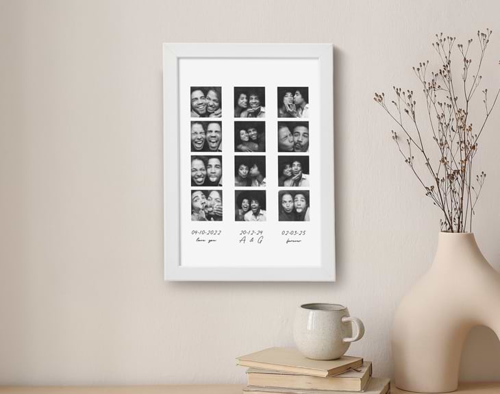 Llena de recuerdos y sonrisas este marco con fotomatón y convierte cualquier rincón en el lugar más emotivo de la casa. Es un regalo personalizado perfecto para sorprender a esa persona especial con algo lleno de significado y de vuestros mejores momentos juntos. Porque las fotos no deberían quedarse solo en el móvil… ¡es hora de darles vida y llenar tu hogar de recuerdos reales! Esta lámina en tamaño A4 viene acompañada de un marco blanco de aproximadamente 24,2 x 33,3 cm. Su diseño elegante y minimalista encaja a la perfección con cualquier estilo de decoración. Puedes colgarlo en la pared o colocarlo sobre una estantería: en cualquier lugar destacará y te hará revivir cada día ese viaje, boda o momento inolvidable que hayas elegido. Personalizar tu lámina es facilísimo. Añade el producto al carrito, sube tus doce fotos favoritas y escribe el texto que quieras debajo: una fecha, vuestras iniciales, una frase especial… Cada detalle hará que este marco sea tan único como vuestra historia. Sorprende con un regalo original en un cumpleaños, aniversario, San Valentín o cualquier ocasión que merezca un recuerdo eterno. Medidas del marco: 24,2 x 33,3 cm aproximadamente.