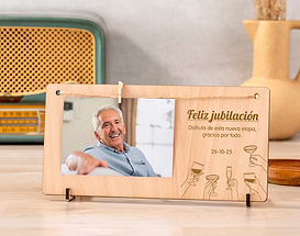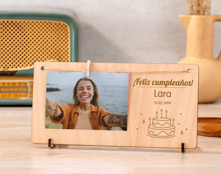 ¿Se acerca el cumpleaños de esa persona especial y aún no sabes qué regalarle? No te preocupes, porque tenemos una idea genial: nuestro marco personalizado con foto, un detalle lleno de amor que hará que ese día sea inolvidable. Este marco es el regalo de cumpleaños perfecto para sorprender. Está hecho de madera y, gracias a sus dos soportes, se mantiene de pie en cualquier rincón. Puedes elegirlo sin foto, solo con su texto grabado, o con foto, eligiendo la imagen que más te guste y escribiendo un mensaje especial que será grabado con mimo. Así se convierte en un adorno de madera original, único y muy personal. Un detalle diferente, emotivo y que durará para siempre. Una sorpresa preciosa para celebrar un día tan maravilloso. Personalizarlo es muy fácil, solo tienes que añadir al carrito el modelo que prefieras, con o sin foto. Después, en el área de diseño, sube tu imagen favorita y escribe las frases o palabras que quieras dedicar. Y si eliges el marco sin foto, solo tendrás que completar el diseñador de texto y listo. Tendrás un regalo ideal para cualquier cumpleañero, que llenará su día de alegría y le recordará, cada vez que lo mire, cuánto le quieres. Medida de la foto: 13x9 cm Medida del marco: 26x13 cm