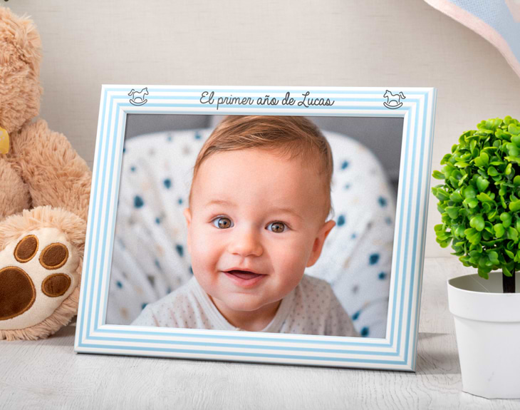 Este marco personalizado está diseñado y grabado exclusivamente para los bebés. Es un regalo perfecto para los amigos que han tenido un niño o mismamente dentro de tu familia. ¿Algún bebé que vaya a cumplir un año? Como el primer año de vida es muy importante, regala este marco grabado con el nombre del pequeño e inserta una foto original que resuma todo lo vivido en 365 días. Por ejemplo, puedes hacer un collage con una foto por cada mes del año. ¡Es un detallazo para los padres! Tamaño de la foto en marco pequeño: 18 cm x 24 cm. Tamaño de la foto en marco grande: 21 cm x 29,7 cm. Tamaño del marco pequeño: 21,5 cm x 27,5 cm. Tamaño del marco grande: 24,5 cm x 33 cm.