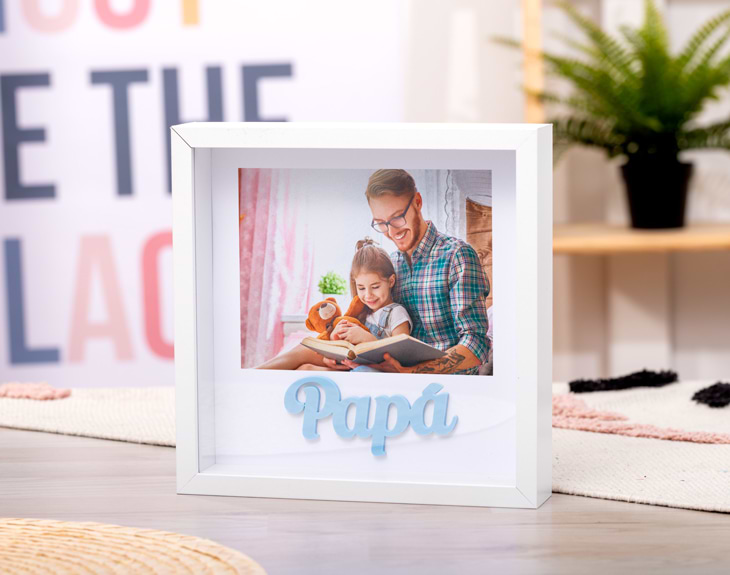 ¿Quieres sorprender al rey de la casa? Nuestro marco personalizado con foto es el regalo perfecto para cualquier ocasión especial. Le encantará, es un detalle precioso que emocionará y, además, decorará cualquier rincón del hogar con estilo y mucho cariño. Porque Papá se merece todas las cosas bonitas y detalles únicos como este. Es ideal para el Día del Padre o cumpleaños, o simplemente para recordarle lo especial que es para ti. Este marco tan colorido es una opción perfecta. Está fabricado en madera, y la palabra “Papá” está hecha en metacrilato azul pastel, creando un conjunto elegante y lleno de sentimiento. Si quieres revivir un momento especial, este marco es una forma preciosa de hacer un regalo original para ese papá tan querido. Personalizarlo es muy fácil: solo tienes que añadir el producto al carrito y elegir esa foto que más te guste, ya sea una imagen de los dos juntos o una de él solo. El resultado será un recuerdo único que quedará precioso y nunca pasará desapercibido. Este marco con foto para papá quedará perfecto para decorar cualquier rincón que desee. Importante: este producto contiene una pequeña ranura en la parte superior. Medidas del marco: 21,5 x 21,5 x 4,5 cm.