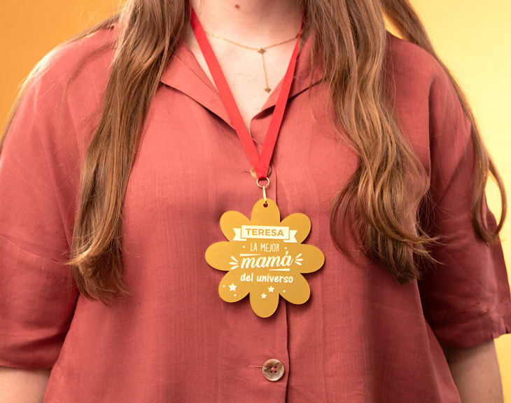 En el universo podemos encontrar diferentes tipos de madres y entre todas ellas podemos encontrar a la mejor madre del mundo. Esa mujer tiene que ser muchas cosas: honesta, carismática, con sentido del humor, pero sobre todo cariñosa y paciente. Si tu madre reúne todas esas características, esta medalla de metacrilato personalizada será el mejor homenaje que le puedas hacer. Esta medalla de oro con forma de flor y diseño de mamá está pensada para las mejores madres del universo, para aquellas que siempre están ahí incluso en los peores momentos. La medalla está hecha de metacrilato transparente y está recortada al estilo de una flor, creando un producto perfecto para mamá. ¡Este incluye la cuerda roja para la medalla! Será la mejor forma de homenajearla en un día tan especial como este. Y es que este regalo original por el Día de la Madre se sale de los clásicos detalle de estas fechas pero al mismo tiempo mantiene su esencia, gracias a su recorte en forma de flor. Podrás personalizar este diseño añadiendo el nombre de mamá en el área de personalización. Solo tendrás que acceder al mismo añadiendo el producto al carrito y clicar sobre el cuadro de texto para crear ese bonito regalo para tu madre. ¡Celebrad este día como nunca antes gracias a este regalazo! Medida: 10 centímetros. Material: metacrilato.