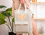 • Mochila beige de algodón reciclado personalizada. • Tarjeta recordatoria.
