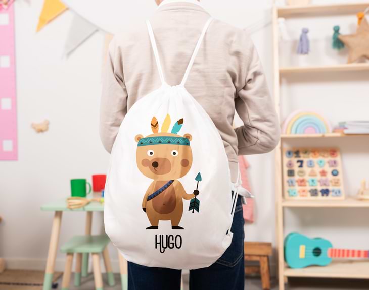 La vuelta al cole siempre se hace un poco cuesta arriba. Después de unas vacaciones increíbles lo último que apetece es volver a la rutina. Que si volver a madrugar, hacer deberes, volver a estudiar para los exámenes… Aunque la llegada de septiembre también tiene sus cosas buenas como reencontrarse con los compañeros, volver a las clases con los mejores profes o a las actividades extraescolares. Ya que ahora con la vuelta al cole va a tener que pasar mucho tiempo fuera de casa es importante que salga bien preparado y que lleve todo lo necesario. Por eso, si quieres tener un detalle con el más peque de la casa para animarle con su nueva rutina, esta mochila de cuerdas es el regalo perfecto. Se volverá su nueva compañera de aventuras, ideal para llevarla a las excursiones, a las actividades extraescolares o para llevarla al parque. ¡Siempre llevará todo lo necesario allá donde vaya! Tiene un diseño monísimo con nuestro estampado de animales de la tribu. Se puede elegir entre un mapache, un conejito, un koala o un oso pardo, elige el favorito de tu hijo y ya verás la carita de ilusión que pone. Lo más especial de todo es que es personalizable. Tú nos dices el nombre que quieres y nosotros lo ponemos en la mochila justo debajo del animalito. Para personalizarlo, lo primero es añadir el producto al carrito y entrar al área de personalización. ¡Quedará perfecto! Medidas: 34,5 cm x 41 cm. Material: suave poliéster 210T