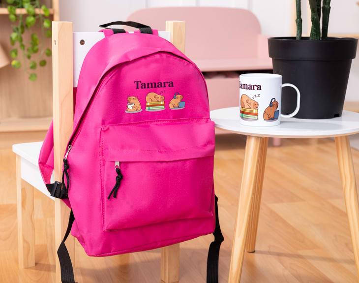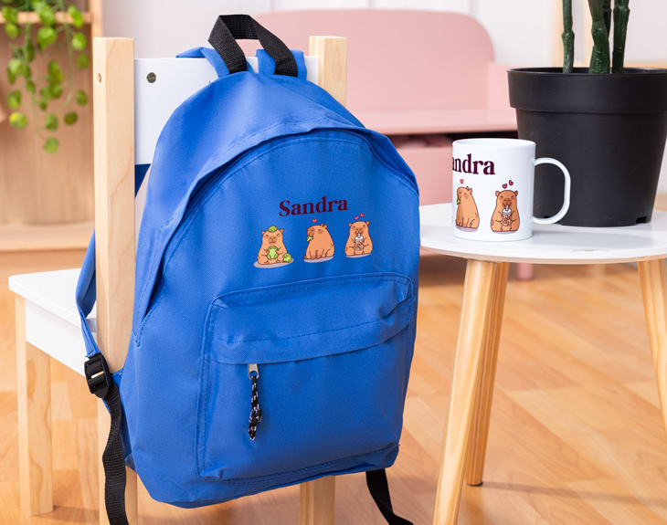 Se acerca la vuelta al cole y es el momento perfecto para renovar la mochila de tu peque. Nuestro pack de mochila y taza de plástico personalizado es el kit ideal para empezar las clases con energía y estilo. Además, podrás elegir entre dos divertidos diseños de capibaras que seguro le encantarán. ¡Sorpréndele y acertarás seguro! Este pack incluye todo lo necesario para que tu hijo o hija disfrute de un curso inolvidable. La mochila en varios colores, tiene el tamaño perfecto para guardar libros, lápices y todo lo imprescindible para el día a día. Por su parte, la taza de plástico es perfecta para que pueda disfrutar de sus zumos o batidos favoritos. También es una opción genial para regalar a amiguitos, peques de la familia o como recuerdo en fiestas de cumpleaños. ¡Tus invitados más pequeños se irán encantados con su kit personalizado de mochila y taza! Sin duda, el mejor regalo original para la vuelta al cole. Personalizarlo es muy sencillo: solo tienes que elegir el diseño de capibara que más te guste, añadir el nombre del peque tanto en la taza como en la mochila, y listo. Tendrás una sorpresa única, práctica y divertida para empezar el curso con buen pie. Material de la taza: plástico. Capacidad de la taza: 33 cl. Medidas de la mochila: 38x40 cm. Esta taza es apta para lavavajillas y microondas.