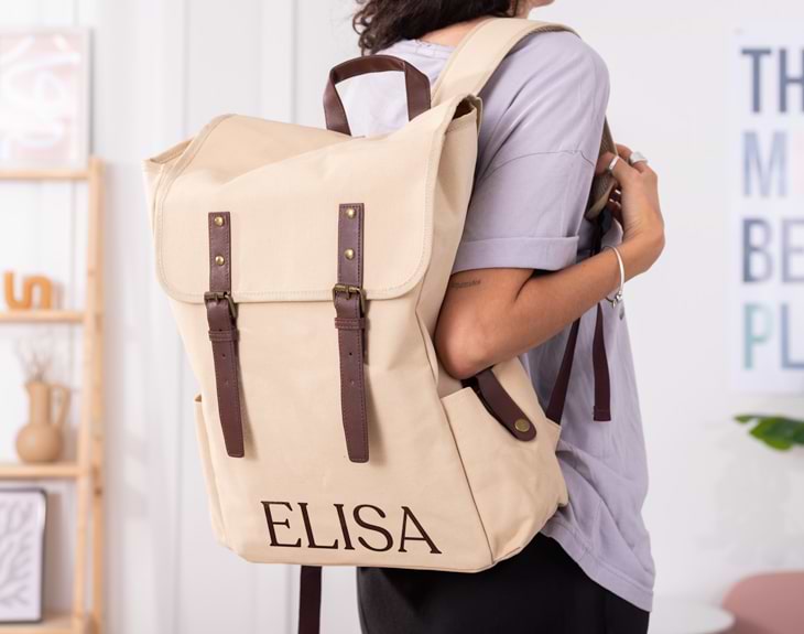 Si te consideras una persona todoterreno a la que le encanta llevar un montón de cosas allá donde va... ¡esta mochila personalizada es el accesorio que necesitas! Es ideal para viajar, para ir al trabajo o para cualquier situación que necesites. Sin duda, esta preciosa y práctica mochila será tu mejor aliado para tus próximas aventuras. ¡Es lo más! Nos encanta esta original mochila porque tiene todo lo necesario para ser tu mejor compañera vayas donde vayas. cuenta con asas ajustables y detalles en polipiel que hacen que esta mochila sea única. Pero eso no es todo, en su interior tiene un compartimento independiente para aparatos electrónicos, la zona de la espalda está acolchada y sus bolsillos exteriores hacen que sea súper útil. ¡Es la mochila perfecta! Y lo mejor de todo es que es personalizable, por lo que podrás añadir el nombre que quieras y tener una mochila única para cualquier ocasión. Solo tienes que añadir el producto al carrito y entrar en el diseñador para poder personalizarla como tú quieras. ¡Será un regalo único! Medidas: 32 x 44 x 14 cm. Material: Canvas/PU. Colores disponibles: azul y beige.