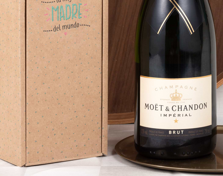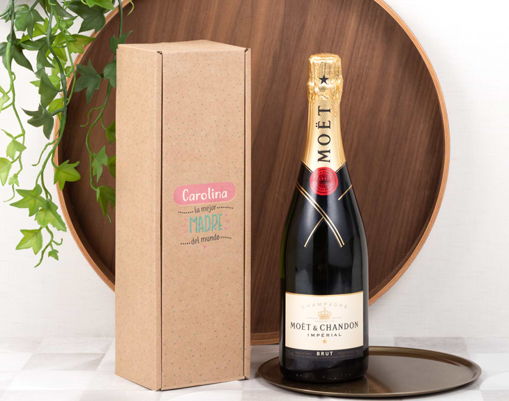 • Caja de cartón personalizada. • Botella Moët & Chandon 750 ml. • Tarjeta Recordatoria. IMPORTANTE:: Prohibida la venta de bebidas alcohólicas a menores de 18 años. Moët & Chandon es una conocidísima marca francesa de champán que ha dado la vuelta al mundo. Asociada al lujo, sus botellas se venden por millones y es la elección preferida de famosos y gente adinerada a la hora de celebrar sus fiestas. Sin embargo, no es un tipo de licor inaccesible y, por menos de lo que pensamos, podemos disfrutar de una deliciosa copa de Moët & Chandon en una ocasión especial. Nosotros os ayudamos a daros el capricho y, al mismo tiempo, a sorprender a uno de los seres más importantes de nuestras vidas: nuestra madre. La botella no permite la personalización, pero la cajita en la que va presentada sí lo hace. Esta caja está fabricada en cartón rígido y, a pesar de su material, podremos reutilizarla sin problemas cuando gastemos toda la botella. Os vendrá genial para exponer vuestras bebidas favoritas y es una forma excelente de presentación en una comida o cena especial. Pero lo mejor sin duda es su diseño, y es que está pensado para derretir el corazón de cualquier madre. Junto a la frase “la mejor madre del mundo” irá colocado el nombre que nos indiquéis al hacer el pedido. Dispondrás incluso de una vista previa para poder ver cómo será el resultado. Nosotros imprimiremos esa vista final directamente sobre la tapa de la caja y protegeremos tu exclusiva botella de Moët & Chandon con ella. Un regalazo que seguro que no se irá de la memoria de tu madre en un buen tiempo.