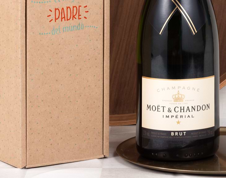 • Caja de cartón personalizada. • Botella Moët & Chandon 750 ml. • Tarjeta Recordatoria. IMPORTANTE:: Prohibida la venta de bebidas alcohólicas a menores de 18 años. Disfrutar de una deliciosa botella de Moët & Chandon parece un lujo al alcance de solo unos pocos, sin embargo, siempre hay un momento de nuestras vidas que merece celebrarse con lo mejor: una boda, un nacimiento, un ascenso… Pero si quieres ir un poco más allá y hacer este momento inolvidable, nada como nuestro regalo de Moët & Chandon con caja personalizada. No solo contarás con una espectacular botella del champagne más famoso del mundo, si no que tendrás una cajita ideal y personalizada con tu nombre, perfecta para recordar para siempre este momento tan especial. La botella de Moët & Chandon no es personalizable pero, como hemos comentado, esto si es posible en el caso de la caja que la acompaña como presentación. Está fabricada en cartón rígido, por lo que es muy resistente y podremos reutilizarla en el futuro. Nosotros la diseñamos en la portada de la caja, imprimiendo directamente sobre el material el diseño que nos hagas llegar. La personalización en este caso consiste en anotar el nombre de ese padre tan especial en un diseño pensado solo para él: unido a la frase “el mejor padre del mundo”. Solo tienes que pulsar sobre el botón + que encontrarás en la plantilla de diseño, y dispondrás incluso de una vista previa para que puedas ver el resultado. Por nuestra parte, trasladaremos la personalización a la cajita y prepararemos tu pedido especial con todo el mimo del mundo. ¡La celebración de este año se recordará por todo lo alto con este regalo!