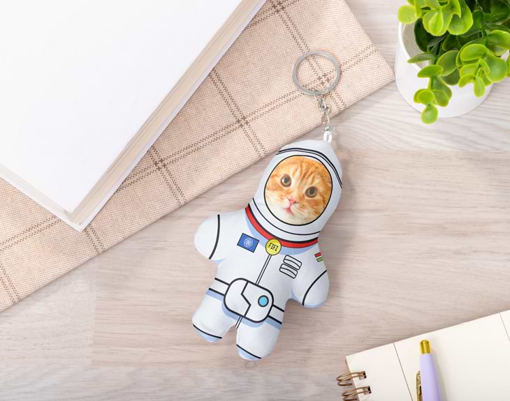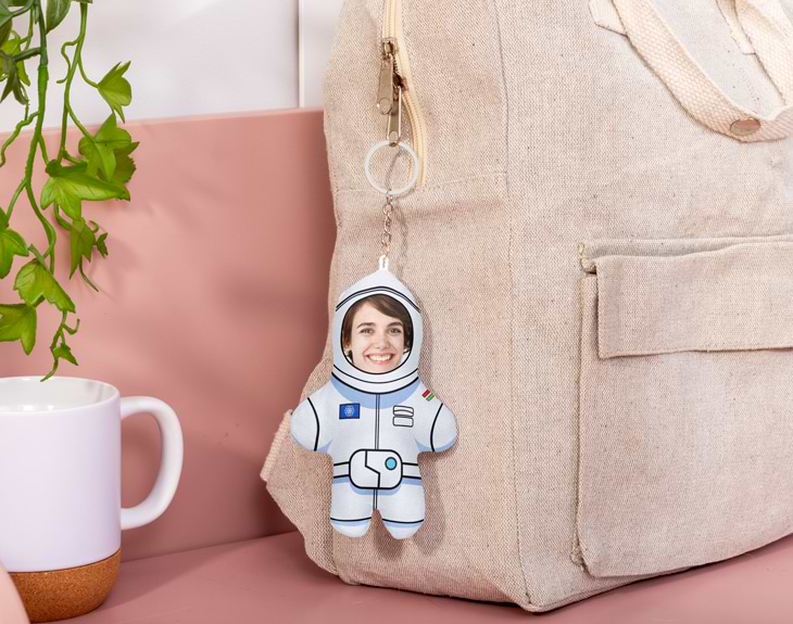 Todavía queda muchísimo por explorar en el espacio y seguro que hay planetas y territorios todavía desconocidos para los humanos. Si eres un fanático del espacio, este llavero de peluche personalizado con foto será el regalo perfecto para cualquier ocasión. Este original llavero de astronauta está hecho para sacarle una sonrisa a alguien en su cumpleaños, el amigo invisible o cualquier otra fecha especial. Nadie tendrá un llavero tan chulo y diferente como este. Además, podrás añadir la cara de quién tú quieras... ¡Incluso la de tu mascota! Y no te preocupes porque personalizar este llavero es más sencillo que viajar al espacio. Entra en nuestro diseñador, sube la imagen de la cara que quieres poner, recórtala a tu gusto y listo. Tendrás un llavero que no pertece a este planeta y que conquistarás todo los corazones. ¡Es perfecto! Medidas del muñeco: 14 x 9 cm. Material: poliéster.