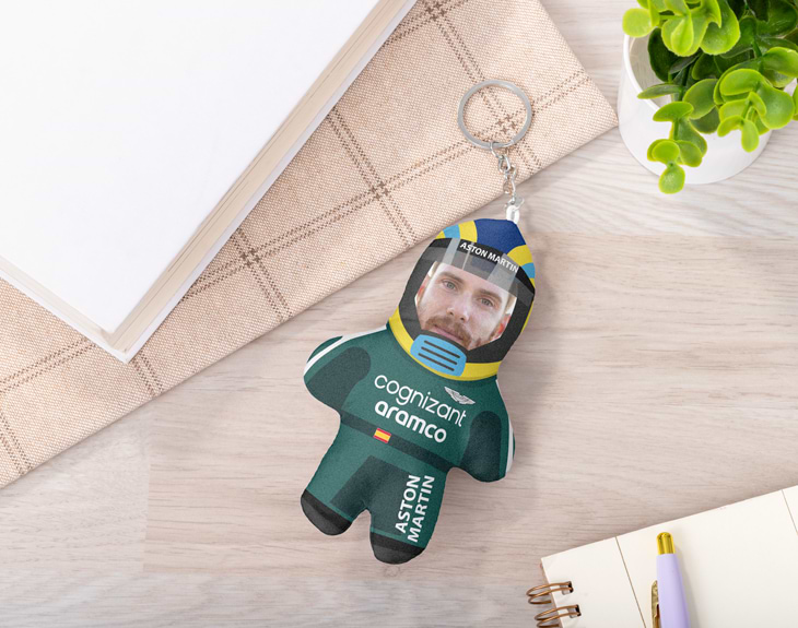 La Fórmula 1 es de los deportes más arriesgados y peligrosos que existen. A pesar de eso, en España contamos con uno de los mejores pilotos: ¡Fernando Alonso! Si quieres vestir como el asturiano, solo necesitas tu propio llavero de peluche personalizado con foto. ¡Formarás parte del equipo de Aston Martin! Si siempre has querido ser como Fernando Alonso, este original llavero cumplirá tu sueño. Y es que podrás añadir la cara de quien tú quieras a este mini muñeco y convertirlo en el regalo más icónico del mundo. ¡Quedará genial en tus llaves o mochila! ¿Cómo puedes personalizarlo? Añade el llavero al carrito y entra en el diseñador para añadir la imagen que quieras, recortarla y colocarla a tu gusto en el espacio que te dejamos. Es muy sencillo y tendrás un regalo único y diferente. ¡Triunfarás seguro! Medidas del muñeco: 14 x 9 cm. Material: poliéster.