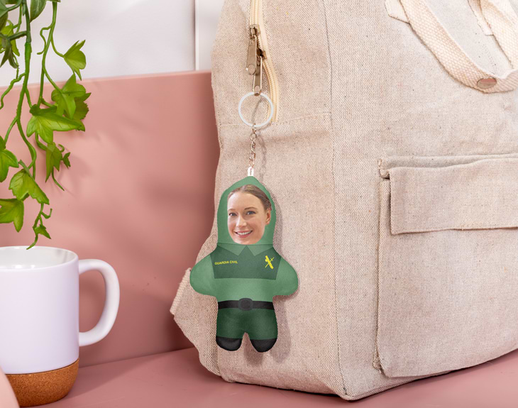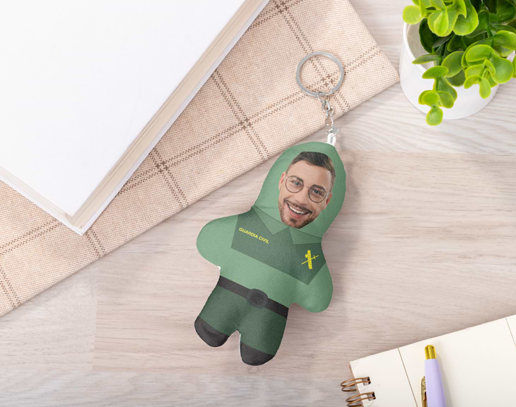 Los guardias civiles son esas personas que velan por nuestra seguridad en todo momento. Si quieres tener un detalle con esa persona que ha logrado su objetivo de convertirse en Guardia Civil, este llavero de peluche personalizado con foto es lo mejor que le puedes regalar. ¡Seguro que le encanta! Nuestro original llavero es perfecto para dejar sin palabras a ese hijo, hermano o novio que ha luchado tanto por conseguir este sueño. Podrá colgarlo en sus llaves de casa o del coche, en la mochila o donde quiera. ¡Es un regalazo! Personaliza el llavero para que sea el mejor regalo que puedas hacerle a ese futuro Guardia Civil, además de un detalle muy divertido. En nuestro diseñador encontrarás el diseño al que solo tendrás que ponerle la cara de quien tú quieras. ¡No habrá un detalle mejor! Medidas del muñeco: 14 x 9 cm. Material: poliéster.