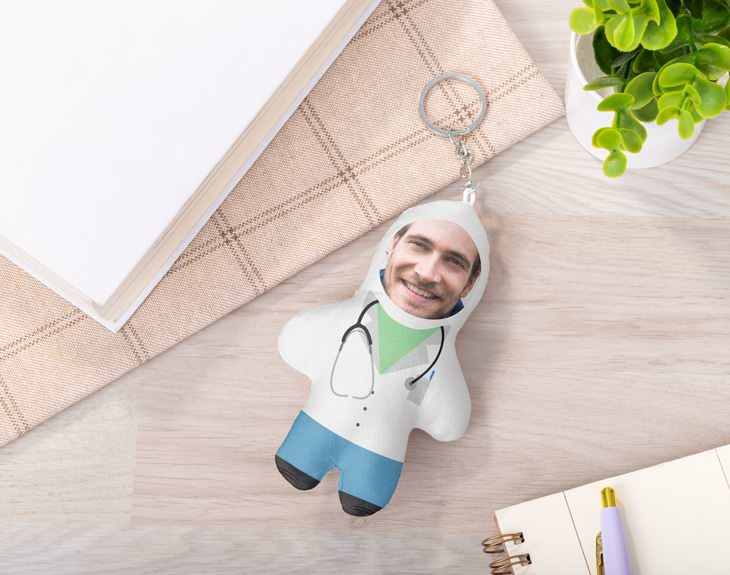 Que alguien de tu entorno consiga convertirse en médico es algo que hay que alabar y celebrar por todo lo alto. Seguro que estarás orgullosísimo de ese amigo o familiar que, tras años de carrera, oposiciones, prácticas y sacrificios, ha conseguido cumplir por fin su sueño de convertirse en doctor o doctora. Sorpréndele con su propio llavero de peluche personalizado con foto y la mítica bata de médico que todos conocemos. ¡Le encantará! Este original llavero dejará sin palabras al futuro médico. Irá vestido con su bata blanca y su fonendoscopio y te aseguramos que quedará genial en las llaves de casa, del coche, en una mochila o un bolso. ¡E irá contigo vayas donde vayas! Si alguien cercano a ti ha conseguido superar el MIR y ser el mejor doctor o doctora del mundo, no pierdas más tiempo y ponte a personalizar este llavero para que sea un regalo único. Sube a nuestro sistema la imagen que quieras y colócala en el espacio vacío que te dejamos. ¡Quedará genial! Medidas del muñeco: 14 x 9 cm. Material: poliéster.