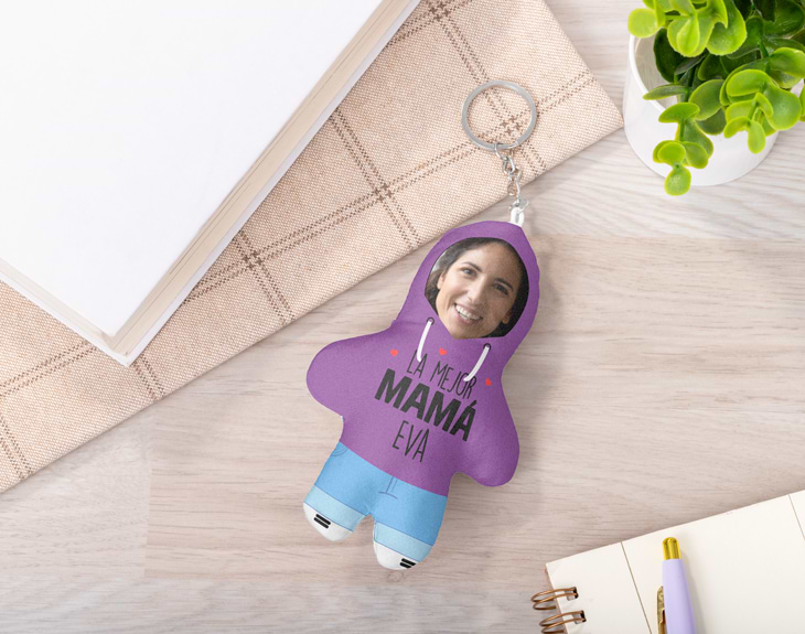 Una madre no se puede comparar con nadie, para ti siempre va a ser la mejor. Por eso, si quieres sorprenderla con un regalo único que seguro que no tiene nadie, este llavero de peluche personalizado con foto es justo lo que necesitas. Así, nunca olvidará que es la mejor mamá del mundo. Regala a tu madre este original llavero en fechas tan importates como el Día de la Madre o su cumpleaños. Es perfecto para que pueda llevarlo en sus llaves de casa o del coche, o incluso en su mochila o bolso favorito. ¡Todo el mundo querrá tener un llavero igual! Y para terminar este regalo, no te olvides de personalizar este llavero. Es muy fácil. Accede al área de personalización, sube una foto de mamá donde se pueda ver su cara de forma clara y colócala en el espacio vacío que te dejamos. Ajústala a tu gusto y listo. ¡Tendrás el llavero más guay para madres! Medidas del muñeco: 14 x 9 cm. Material: poliéster.