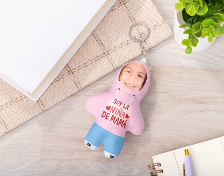 Sentirse como un niño o niña de mamá significa que tu madre te cuide, te escuche, te apoye y sientas que eres su persona favorita en todo el mundo. Y para agradecerle todo esto, solo tienes que regalarle un llavero de peluche personalizado tan guay como este con la cara de su hijo/a. ¡Así podrá llevarlo vaya donde vaya! Toda madre se merece tener este original llavero para acordarse siempre de sus peques esté donde esté. Y es que podrás poner la cara de quien tú quieras en este adorable muñeco hecho especialmente para todas las mamis del mundo. ¡Les encantará! Y antes de poder disfrutar de este regalo, tendrás que personalizarlo para darle tu toque y que sea único. Entra en el área de personalización, elige el color para el peluche (rosa o azul) y sube la imagen al sistema para recortarla y ajustarla a tu gusto. ¡Será el mejor regalo del mundo! Medidas del muñeco: 14 x 9 cm. Material: poliéster.