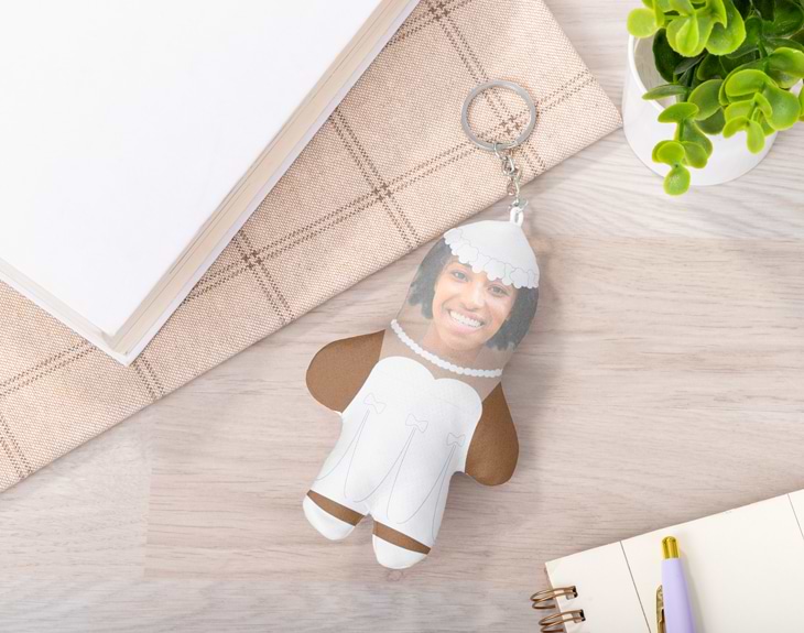 Si estás buscando un regalo original para bodas, estos muñecos llaveros de novios personalizados con una foto de sus caras son la opción perfecta. Si tus amigos están a punto de casarse, este regalo original está hecho para ellos. ¡Son lo más! Atrás quedaron las típicas figuras de novios de la tarta, esta vez hemos querido ir un pasito más allá haciendo estos originales llaveros de peluche para que tengan un recuerdo para siempre de este día tan único. También es una idea fantástica si estáis preparando sus despedidas de solteros, así podrán acompañarles durante todo el viaje. ¡Será super divertido! Lo mejor de todo es que son muy fáciles de personalizar, solamente tienes que subir las fotos de sus caras y adaptarlas con la ayuda de nuestro diseñador. En todo momento te mostraremos una vista previa para que puedas saber cómo quedarán sus fotos con los trajes. ¡Se partirán de risa al verlo! Medidas del muñeco: 14 x 9 cm. Material: poliéster.