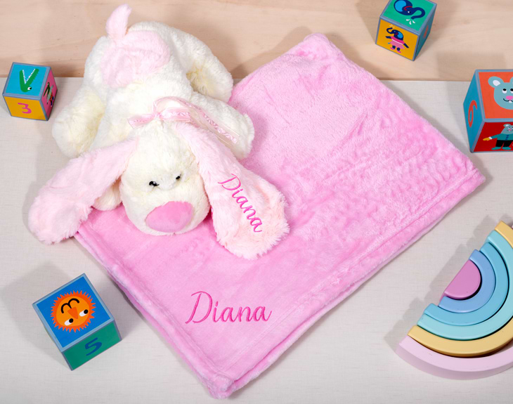 • Manta bordada (aleatorio) (75x100 cm). • Perro de peluche (opción bordado y con voz). • Tarjeta Recordatoria.