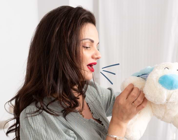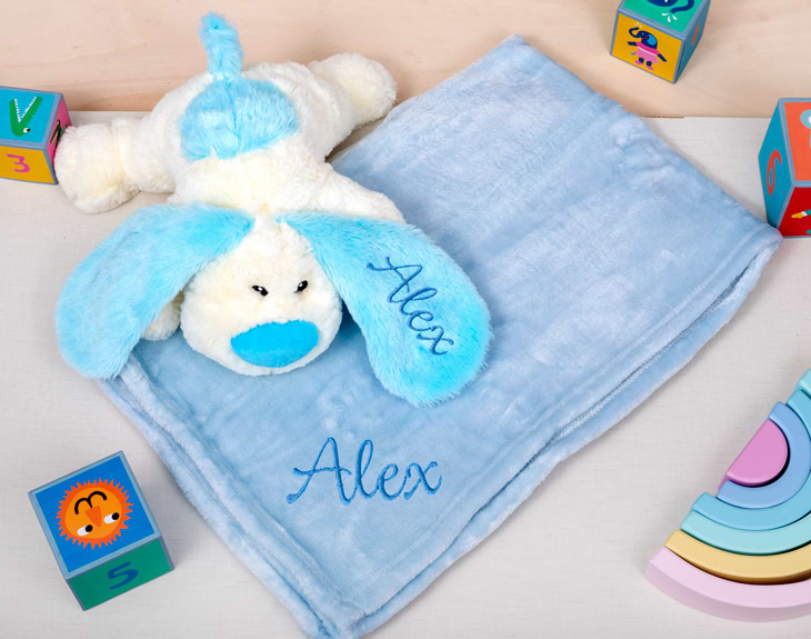 • Manta bordada (75x100 cm). • Perro de peluche (opción bordado y con voz). • Tarjeta Recordatoria.