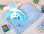 Nuestra manta bordada con un peluche es el mejor regalo para sorprender a los papás y al recién nacido. El peluche es perfecto para que el bebé se tire horas abrazando a su nuevo amigo y la mantita será su mejor aliada en las horas de siesta. Seguro que lo guarda para siempre...¡Imagínate la cara que se le quedará cuando vea de mayor su peluche y su manta preferida de la infancia!. Además, podrás personalizar este peluche añadiendo una grabación de voz. ¡Podrás incluir la voz o canción que quieras en este muñeco! ¿Cómo se graba el mensaje? ¡Es muy sencillo! Añade el peluche al carrito y dale al botón de "personalizar". Podrás grabar un mensaje en ese momento (con el micro del móvil o del ordenador) y nosotros nos encargaremos de incluirlo en el peluche. ¡El único límite es tu imaginación! Puedes cantar, ponerte romántico, hacer una proposición... Límite de grabación: 30 segundos. Una vez se reciba el muñeco, habrá que tomar una difícil decisión: se puede repetir el mensaje original (manteniendo pulsado el bracito derecho del muñeco cada vez que quieras escucharlo) o grabar un mensaje nuevo (cada vez que mantengas pulsado el bracito izquierdo del muñeco). Importante: La manta y el peluche llegan de manera aleatoria. ¡Así es aún más emocionante!
