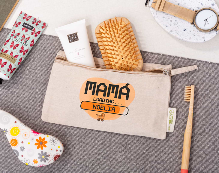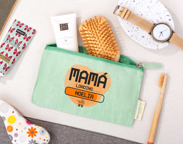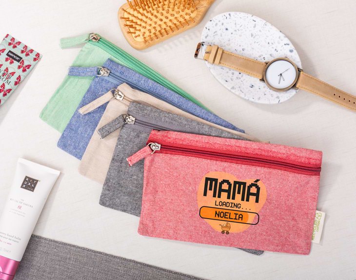 Convertirse en mamá es un proceso super emocionante y lleno de ilusión. Enterarte de que vas a tener un hijo, luego gestarlo 9 meses en tu cuerpo y finalmente verlo nacer. ¡Vaya pasada! Aunque también se hace inquietante la espera. ¿Por qué no hacerla más amena con este neceser de algodón reciclado personalizado? Ya vayas a ser el futuro papi del peque o sea tu amiga la que va a tener el niño este detalle le encantará y seguro que lo usa muchísimo: es súper practico y podrá ordenar todas esas cosillas que suele tener tiradas por el bolso y pronto por la bolsa de pañales, ¡ya verás! Y es que este divertido diseño aparte de ser divertido y personalizado es eco friendly. Está hecho con algodón reciclado y viene en 4 colores distintos: beige, gris, verde y rojo. Elijas la opción que elijas le encantará y se convertirá en un indespinsable en su bolso. Material: algodón reciclado. Medidas: 21x12,5 cm.