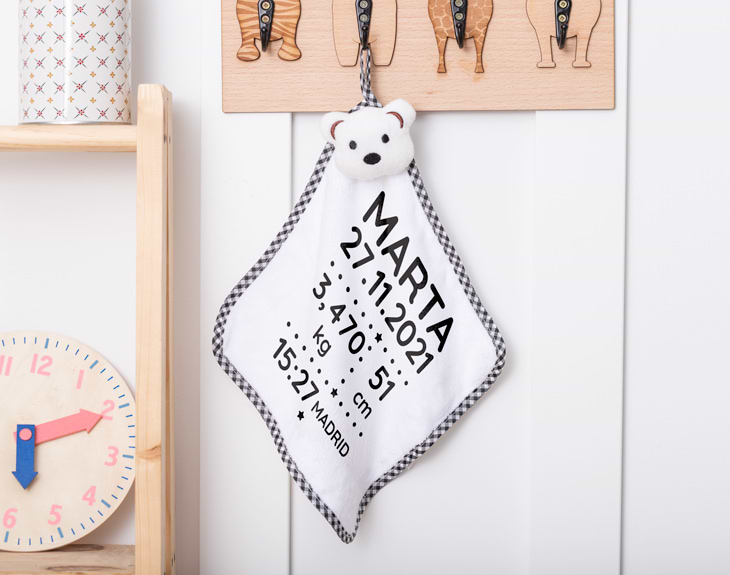 Cuando nace un recién nacido lo único que queremos es mimarle con un montón de regalitos. Si hace poco que tú familia cuenta con un miembro más, está claro que tienes que hacerle el mejor regalo de todos. Y para eso, nuestro osito dudú personalizado con diseño "Datos Natalicios" es el detalle perfecto. Es una preciosa forma de darle la bienvenida al mundo al pequeño bebé y la enhorabuena a estos papis primerizos. Sin duda, lo mejor que tiene es que es personalizable, podrás escribir los datos del nacimiento como el nombre del bebé, la fecha, el lugar, el peso, la altura... ¡Así los papis nunca olvidarán este día tan especial! Personalizar este oso dudú es muy sencillo. El primer paso a seguir consiste en añadir el producto al carrito y entrar al área de personalización. Una vez ahí, ya puedes escribir el nombre del recién nacido. Pronto estará perfecto y listo para regalar. ¡Será un original regalo para nacimientos! Medidas: 33 x 37 cm. Material: poliéster.