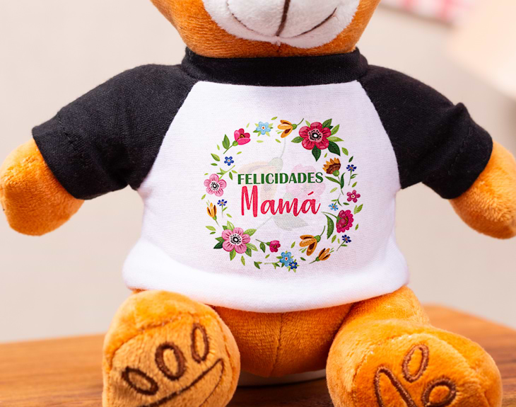¿No puedes felicitar este año a tu madre? ¡Deja que nuestro osito de peluche con camiseta lo haga por ti! Sobre ella, llevará impreso a todo color el mensaje de "Felicidades Mamá". Además, en lugar de tenerlo simplemente escrito, lo acompañará un precioso diseño floral que seguro que le encantará. ¡Lo pondrá en el mejor lugar del salón o en su cama para verlo todos los días! Queremos ayudarte tener tu mejor regalo original para madres. Por ello, además de sorprenderla con el osito de huellitas, podrás añadirle al pack unos deliciosos bombones. Así tendrá algo para disfrutar en el momento y algo para conservar de recuerdo. Si no puedes estar con tu mamá en un día especial, nosotros le enviamos directamente a su casa este oso de peluche con mensaje de felicitación. ¡Y escríbele tu mensaje personalizado en nuestra tarjeta recordatoria una vez introduzcas tus datos! Altura total del oso: 25cm