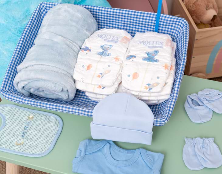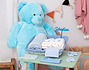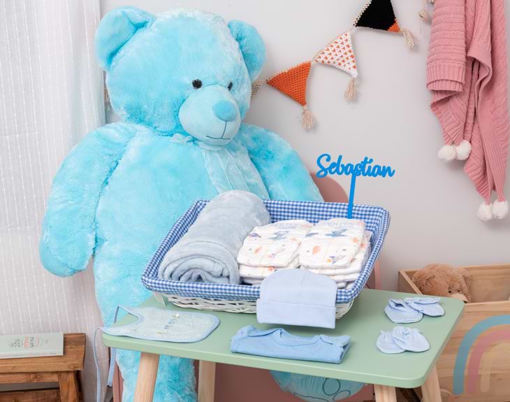 • Oso gigante azul (voz opcional). • 18 pañales • 1 manta • 1 body • 2 calcetines • 2 manoplas • 1 babero • 1 gorrito • Cesta de mimbre • Metacrilato personalizado (opcional) • Tarjeta Recordatoria.