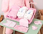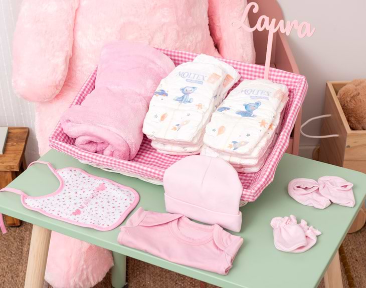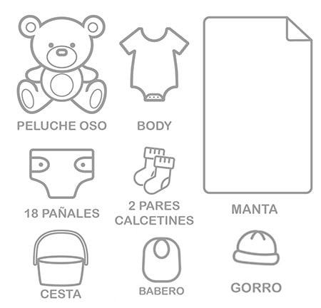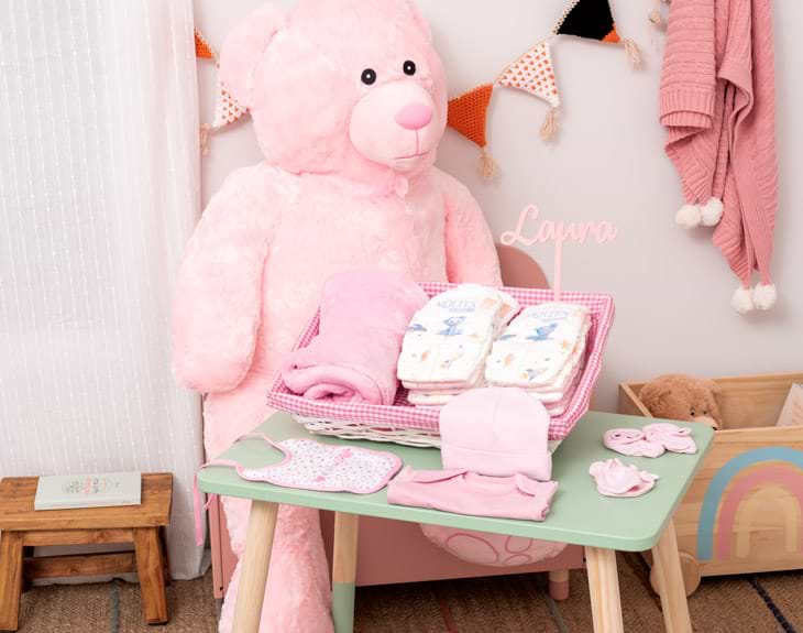 • Oso gigante rosa (voz opcional). • 18 pañales • 1 manta • 1 body • 2 calcetines • 1 babero • 1 gorrito • Cesta de mimbre • Metacrilato personalizado (opcional) • Tarjeta Recordatoria.