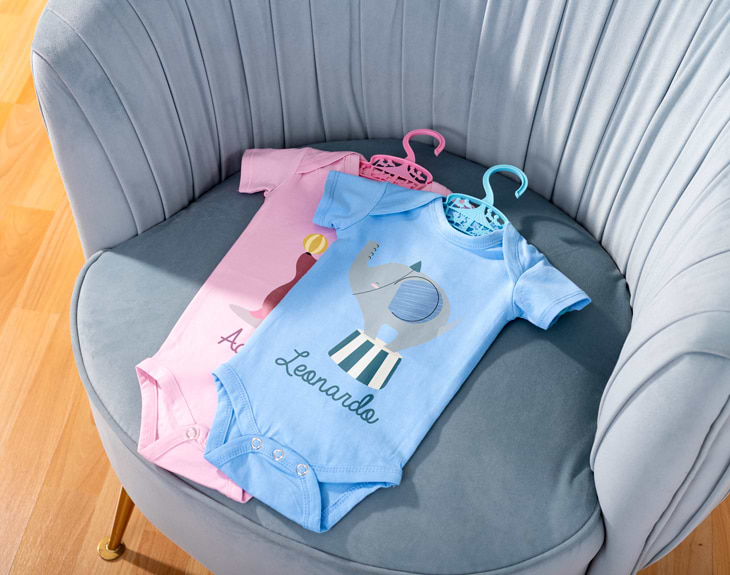 • Body personalizado. • Percha para body. • Tarjeta recordatoria.