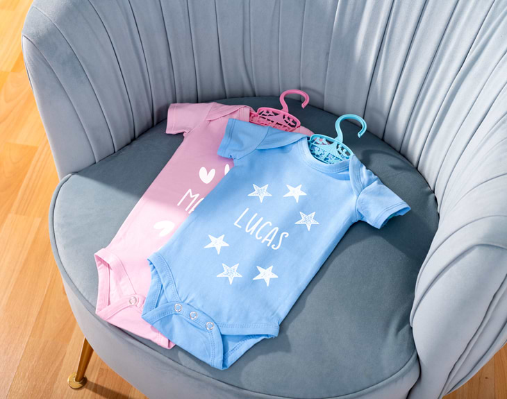 • Body personalizado. • Percha para body. • Tarjeta recordatoria.