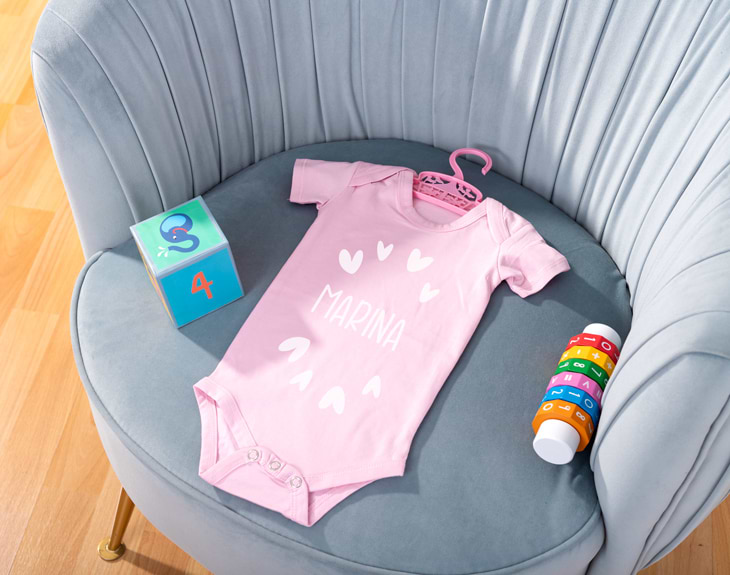 ¿Quieres sorprender al nuevo miembro de la familia? Si quieres darle la bienvenida al mundo de la manera más original de todas, tenemos el regalito perfecto. Se trata de nuestro pack de body y percha personalizado con diseño "Nombre amoroso". ¡Ya verás que ordenadito y mono queda su armario con este body en una percha a medida! Y lo mejor de este body es que es personalizable, no habrá otro igual, podrás escribir el nombre del peque. ¡Quedará genial! Este body está disponible en cuatro colores: azul, negro, blanco o rosa. Imagina la ilusión que le hará a los papis del bebé recibir este body personalizado, les encantará. Estos bodys están fabricados en suave tela de algodón, perfecta para la delicada piel de los más pequeños. Cuentan con cuello tipo americano y con corchetes en la parte inferior para hacer los cambios de ropa o pañal mucho más sencillos. Son de manga corta y están disponibles en tallas desde los 3 meses hasta los 18 meses. Por último, personalizar este pack de body y percha es muy sencillo. El primer paso a seguir consiste en añadir el producto al carrito y entrar al área de personalización. Una vez ahí, ya puedes escribir el nombre del recién nacido y escoger el estampado que quieras. Pronto estará perfecto y listo para regalar. ¡Será un original regalo para nacimientos!