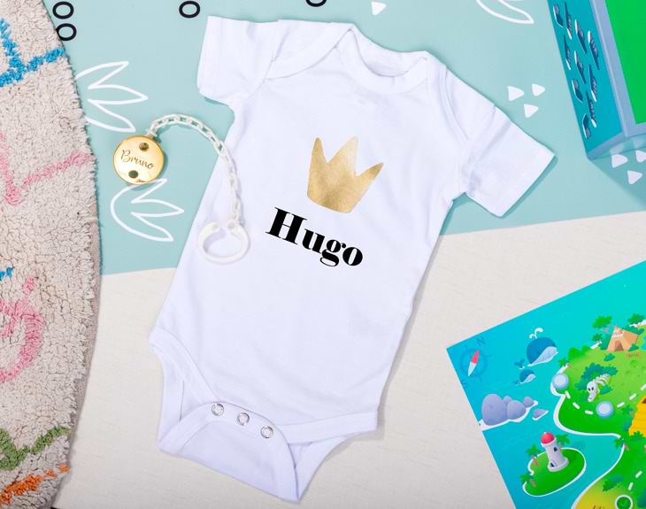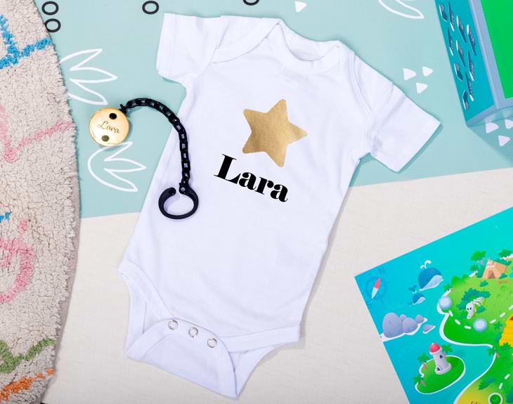 ¡El nacimiento de un bebé es lo más bonito que existe! Marca un antes y un después en la vida la familia y siempre llena de ilusión y ternura la casa. Si dentro de poco tu familia va a tener un nuevo miembro, tenemos el mejor regalo para el recién nacido. Se trata de nuestro kit con body y sujeta chupetes personalizado con diseño "Símbolos dorados". Y lo mejor de este pack es que es personalizable, podrás escribir el nombre del peque en el sujeta chupetes dorado y en el body. ¡Quedará genial! Sin duda, es una preciosa forma de darle la bienvenida al mundo y la enhorabuena a los padres. Imagina la ilusión que le hará a los papis del bebé recibir este body personalizado, les encantará. Estos bodys están fabricados en suave tela de algodón, perfecta para la delicada piel de los más pequeños. Cuentan con cuello tipo americano y con corchetes en la parte inferior para hacer los cambios de ropa o pañal mucho más sencillos. Son de manga corta y están disponibles en tallas desde los 3 meses hasta los 18 meses. También puedes elegir el color que quieras entre: azul, negro, blanco o rosa. Por último, personalizar este sujeta chupetes con body es muy sencillo. El primer paso a seguir consiste en añadir el producto al carrito y entrar al área de personalización. Una vez ahí, ya puedes escribir el nombre del bebé y elegir el estampado dorado que más te guste. Pronto estará perfecto y listo para regalar. ¡Será un original regalo para nacimientos!
