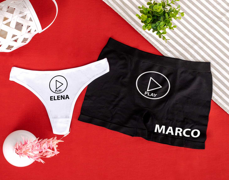 ¿Se acerca San Valentín y todavía no tienes regalo para tu pareja? Si lo que buscas es un detalle íntimo pero quieres que, al mismo tiempo, sea divertido... ¡Está claro que nuestro pack de calzoncillo y tanga personalizado será el regalo perfecto! Lo mejor de este set de ropa interior con diseño "Play" es que es personalizable. Podrás escribir vuestros nombres en cada prenda. ¡Iréis a juego! Además de añadir un toque de picardía a vuestras noches de pasión, este pack también es genial para el día a día porque estas prendas son comodísimas. ¡Triunfarás seguro! Personalizar este pack de ropa interior es súper sencillo. El primer paso a seguir consiste en añadir el producto al carrito. Una vez ahí, ya puedes escribir el nombre que tú quieras, nosotros nos encargamos de todo lo demás. Pronto estará perfecto y listo para regalar. ¡Será un original regalo para parejas! Especificaciones tanga: Medidas: 30 x 21,5 cm. Talla: S, única. Material: algodón natural. Color: blanco Especificaciones calzoncillo: - Talla M: 33,5 x 25 centímetros. - Talla L: 36 x 26 centímetros. - Talla XL: 47 x 31 centímetros. Material: poliamida (90%) y elastano (10%). Importante: se puede lavar a una temperatura máxima de 30 grados. No es recomendado usar lejía ni secarlo en la secadora. No se debe planchar.