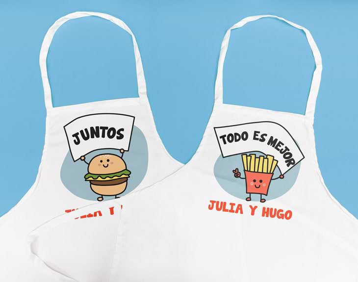 ¿Quién es esa persona con la que te complementas genial en la cocina? ¿O en la vida? ¿Sois tan inseparables como la hamburguesa y las patatas fritas? Entonces solo os queda una cosa más que compartir: ¡vuestros propios delantales de cocina personalizados! Así vuestra conexión no estará solo en vuestra mente o vuestras manos, sino por todo el cuerpo. Como buen equipo de cocina, necesitáis una equipación a juego. Por ello, este pack de delantales blancos se ajustará perfectamente a vosotros. Simplemente tenéis que decirnos vuestros nombres y los grabaremos en ambos delantales, para que juntos podáis completar esa frase que es tan verdad en vosotros dos: ¡juntos todo es mejor! Gracias a su monísimo diseño y a su variedad de tallas, este es el regalo original ideal no solo para parejas sino para padres e hijos, compañeros/as de piso y todos los que os juntéis en la cocina. Si los quieres para adultos, las medidas aproximadas son de 61x78cm, mientras que en infantil son de 51x70cm. -Medidas aproximadas Delantal blanco: 84x57cm. -Medidas aproximadas de la cinta del delantal con foto blanco: 60 cm cada tira. Material del delantal blanco: 100% poliéster.