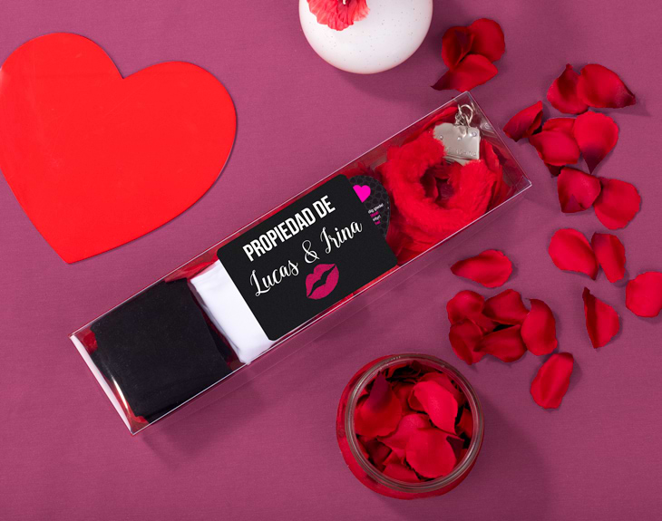• Braga o Tanga personalizada. • Calzoncillo personalizado. • Baraja de cartas kamasutra. • Esposas. • Pétalos sintéticos. • Caja personalizada. • Tarjeta recordatoria.